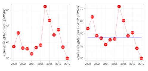 And since 2010, wholesale prices have collapsed. The average price in the last financial year was a touch under $30 per megawatt hour. That is the lowest average annual price recorded on the market since 1999 and is about 40% lower than the long-term average of around $47, adjusted to 2012 dollar terms. Market revenue was down almost $3.5 billion on the yearly average of $9 billion in adjusted terms, and more than $5 billion on forward growth projections.