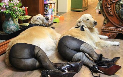 Equally easily, the story could be read as similar to any Internet photo craze: just like planking, just like owling, we could read these doggy dress-up snaps as simply a five-second fame grab, combining the cuteness of puppies and the oddity of stocking thing.