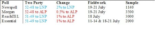The table below shows the two-party result, shift in the two-party from the last result by the same pollster, dates when the poll was conducted (fieldwork dates) and the poll’s approximate sample size.