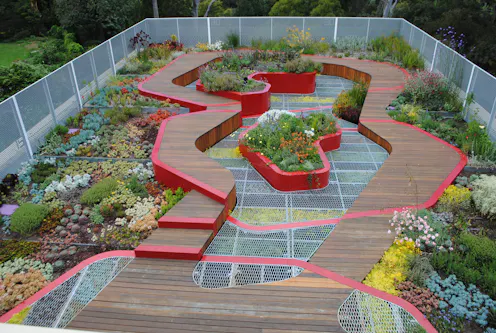 Low growing succulents, such as sedums, and drought-tolerant perennials including many Australian plants, are widely used because of these constraints.