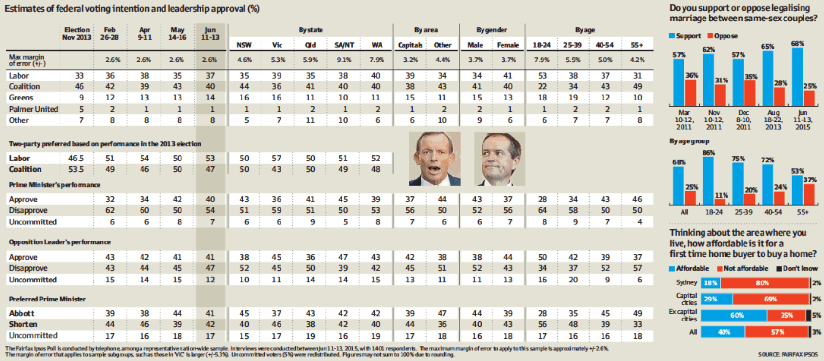 Ipsos had 68% support for same sex marriage, with 25% opposed. Overall, 57% thought homes were unaffordable for first home buyers in their local area, with 40% disagreeing. However, this disguises huge regional variations - capital city residents thought housing was unaffordable by 69-30, while those living elsewhere said it was affordable by 60-35.