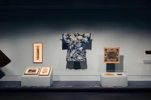 The NGV’s exhibition explores techniques employed to pattern indigo-dyed cloth in textiles from Egypt, Japan, China, Central Asia, India, Indonesia and Italy. Patterning with printed, painted and tied resists, such as batik, yuzen and ikat, which produce a white pattern on an indigo blue field, are contrasted with positive blue patterns produced by printing or weaving.