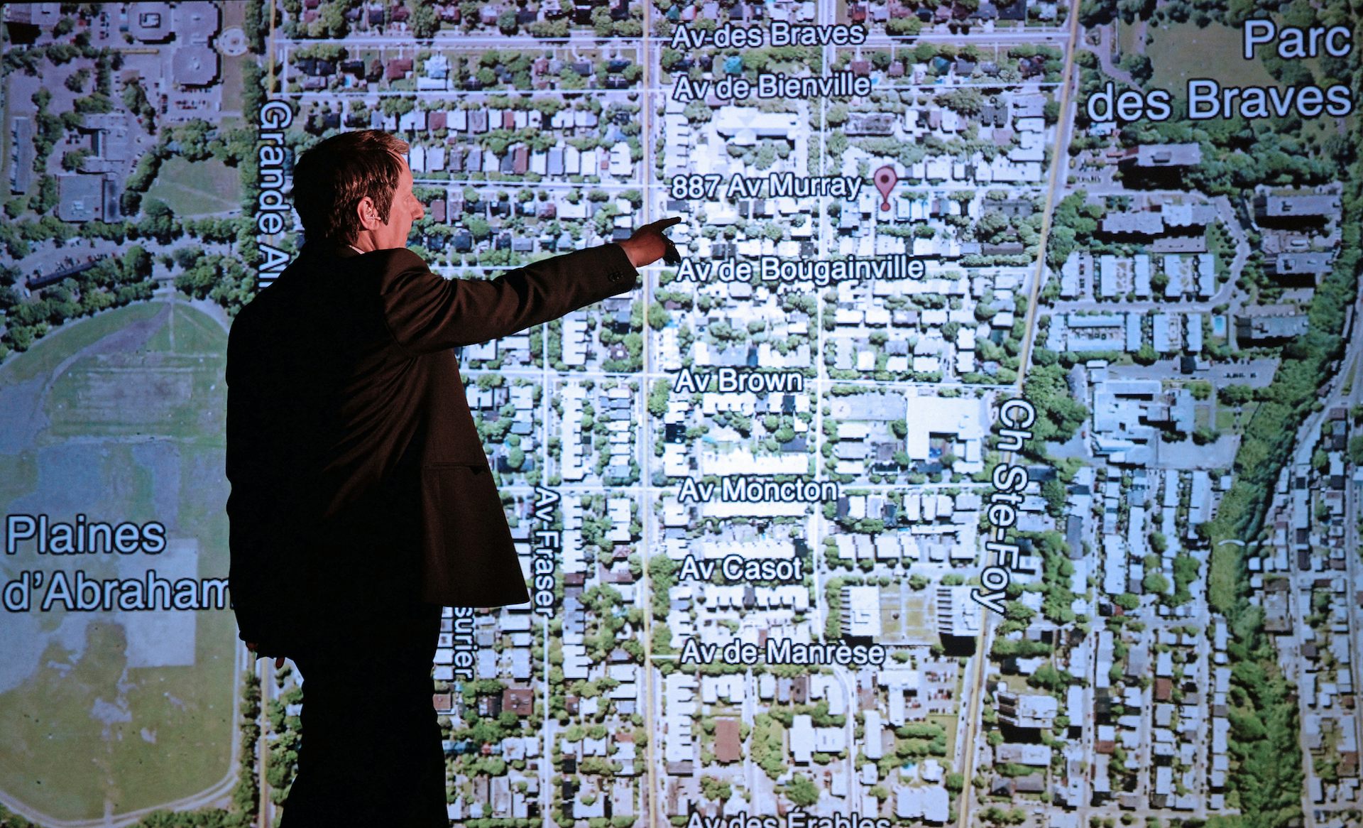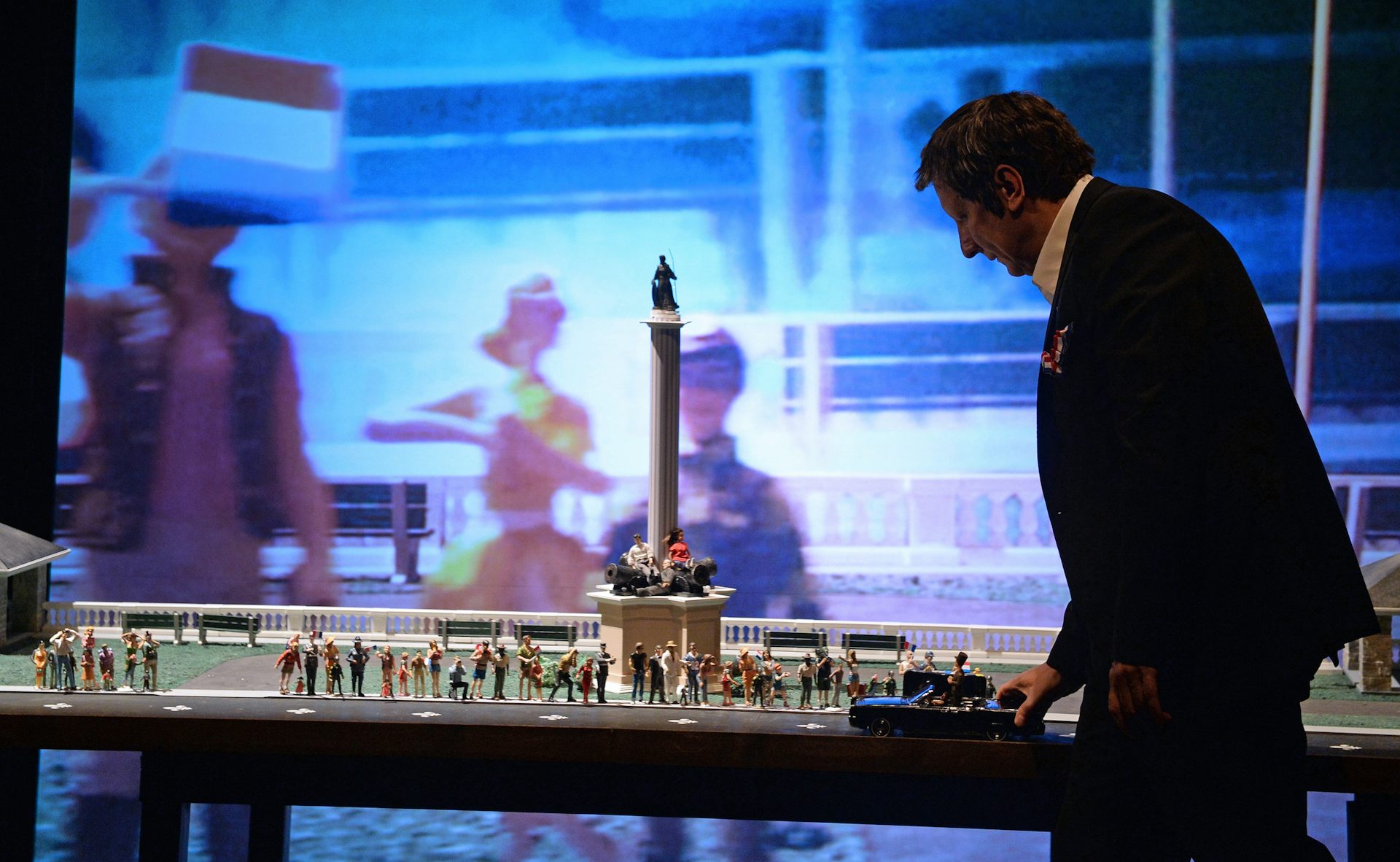 By locating his phone number in the mobile rather than his mind, Lepage showed contemporary technology as externalising memory. Lepage projected video from the phone onto a screen at various points during the show, for instance peering into the scale model apartments of 887 Avenue Murray – often with his comparatively gigantic face and fingers visible through the windows or manipulating the tiny furniture and inhabitants.